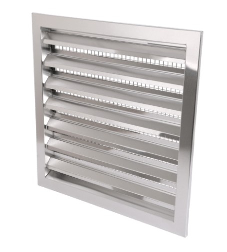 Luftinntak i aluminiumsplate med faste blader og rustfritt trådnett. Luftinntaket egner seg for montering på yttervegg.