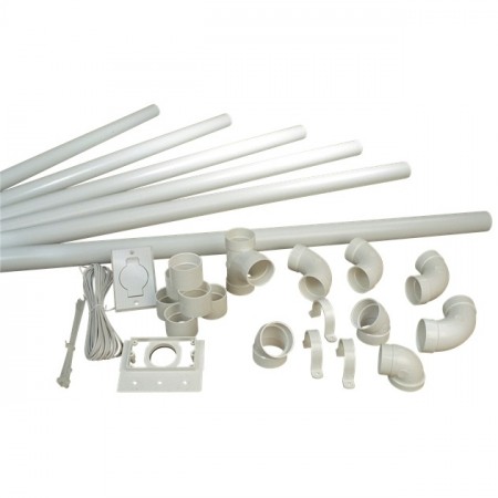 Pakkeløsning med rør og deler for montering av rørsystemet til sentralstøvsugere vi leverer.
