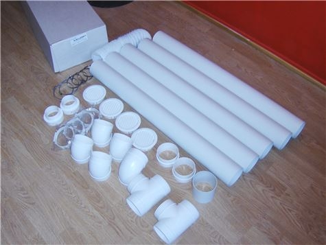 Pakken inneholder et sett med rør, T-stykker, skjøtemuffer, veggfester etc. for en komplett montasje av våre F-DRY Rotor Avfuktere for kjellere, garderober, pumperom, små lagerhaller etc.