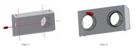 Kombiboksen kan brukes som kombinert friskluftinntak/-avkast på steder der avkastrist over tak ikke er mulig, og avkast i yttervegg ikke er til sjenanse. Kombiboksen er designet på en slik måte at friskluftinntak og -avkastluften skilles godt for å unngå miksing av luft. Kombiboksen kan snus 180° slik at den kan brukes både som høgre og venstrevariant. Montering Kombiboksen monteres enkelt ved at frontstykket demonteres (Figur 1) og bakstykket festes til veggen med 4 skruer (Figur 2) Bruk tetningsmasse mellom kombiboksen og vegg for å unngå vanngjennomtrenging til bygg. Figur 1 Figur 2 Kanaltilkobling til Ø125 / Ø250 mm nippel med pakninger. Kan enkelt rengjøres ved at en skrur ut frontdekselets 6 skruer (Figur 1)