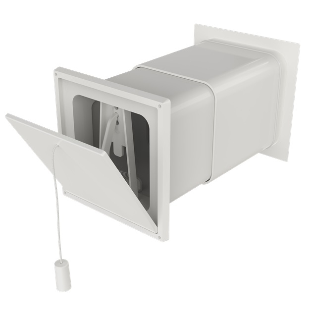 Anbefalt plassering er høyt på vegg og helst over en varmekilde. Med denne plasseringen får man blandet uteluften og den varme inneluften og oppnår god komfort. Med innvendig klaffventil som kan regulere luftmengde i tre posisjoner. Med utvendig sjalusirist.
