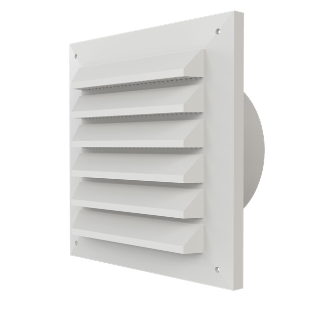 Med integrert insektsgitter og rund stuss tilpasset skjøterør art.nr. 9166, og kanaler med 125 mm diameter. Kan overflatebehandles med maling eller beis.
