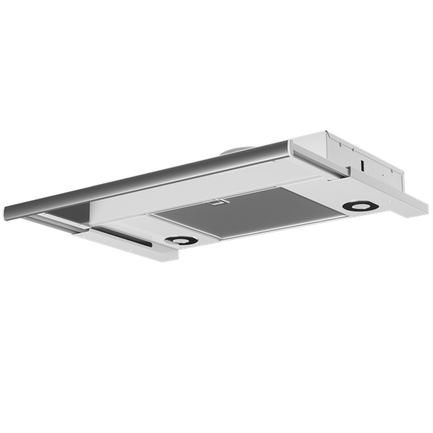 Den innebygde uttrekksdelen trekkes ut ved matlaging og skyves inn under skapet når man er ferdig. Utstyrt med fettfilter i metall som kan vaskes i oppvaskmaskin. Elektronisk skyvespjeld i stål med enkel innstilling av forsert luftmengde og ev grunnventilasjon. Elektronisk betjening og god LED belysning med meget lang levetid. Leveres med 230V jordet kabel med støpsel og ledning for styrestrøm til ventilasjonssaggregat. Det kreves min. 45 cm monteringshøyde mellom elektrisk ovn og underkant kjøkkenhette. For gassovn må avstanden økes til min. 65 cm