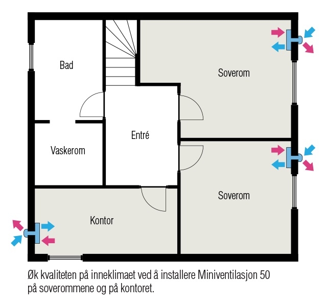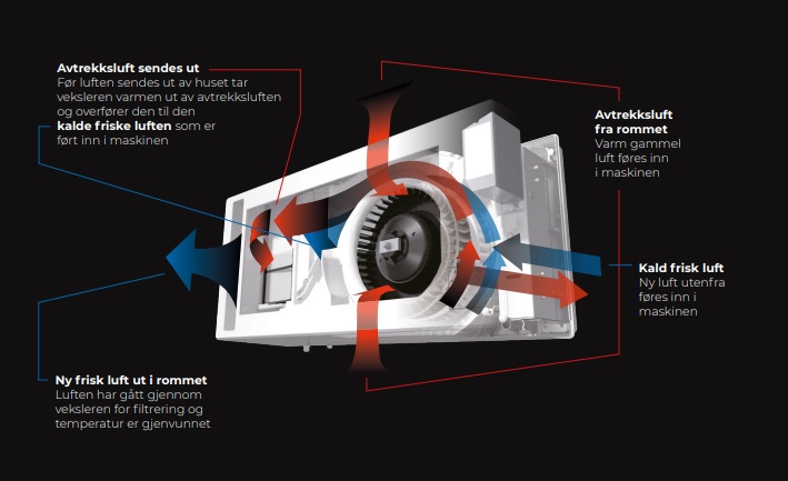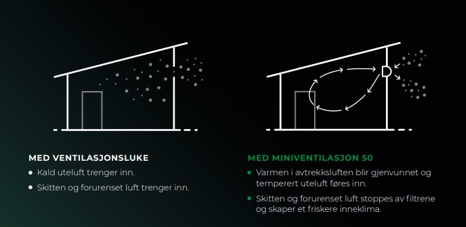 Miniventilasjon 50 er en liten ventilasjonsenhet som kan skifte hele 52,5m3 luft i timen - det tilsvarer all luft i et rom på 20m2. Miniventilasjonen er balansert, og kan gjenvinne opptil 85% av energien i luften den bytter ut.