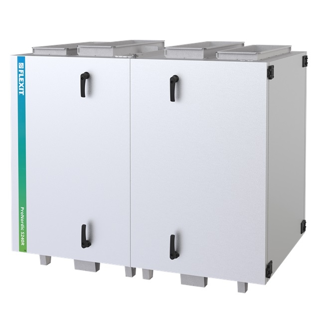 Flexit ProNordic S260R er lagerførte ventilasjonsaggregater for næringsbygg. Leveres som høyrevariant og med 400V-innstilling som standard, men kan på plass enkelt endres til venstrevariant og 230V. Varmebatteri (el/vann) leveres med aggregatene og installeres på plass. Aggregatenes kompakte fysiske mål forenkler inntransporten og gjør produktene fleksible og tilpasningsdyktige til de fleste installasjoner. Fleksibiliteten gir en kostnadsbesparing ved eventuelle endringer i prosjektet og gjør det umulig å bestille feil. Aggregatene kan også bestilles ferdig konfigurerte, som høyre- eller venstrevariant og med varmebatteri etter egne preferanser, men da med litt leveringstid. Enkel styring med Siemens Climatix CS2500 via styrepanelene ProPanel eller ProTouch.
